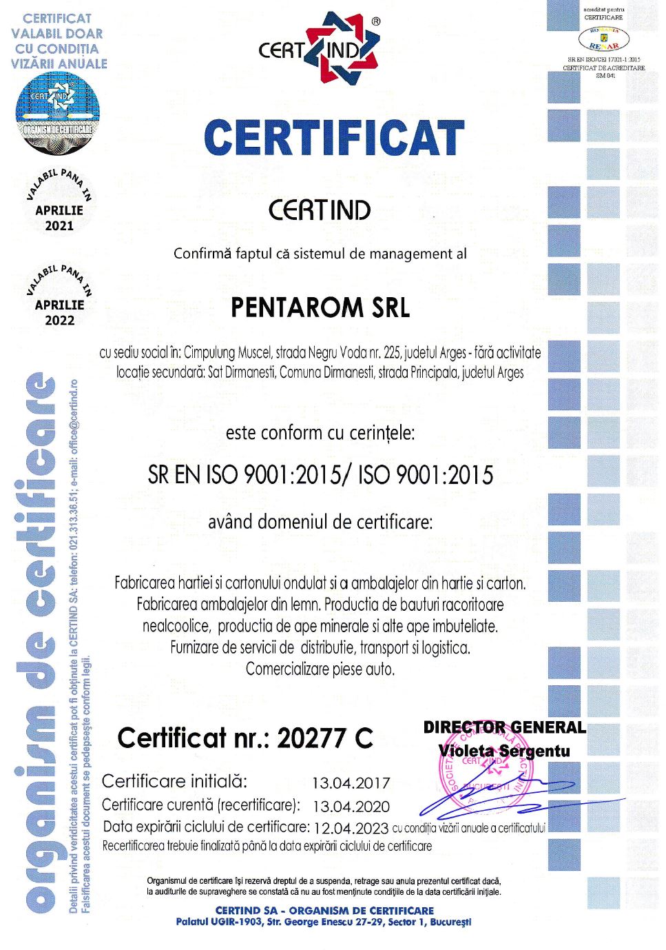 Pentarom funcționează sub implementarea Sistemelor de Management al Calitații, în conformitate cu: SR EN ISO 9001:2015, SR EN ISO 14001:2015, IATF 16949:2016, SR EN ISO 22000:2019, EPAL și Atestat Fitosanitar 065; lucru care atestă calitatea produselor și serviciilor oferite.